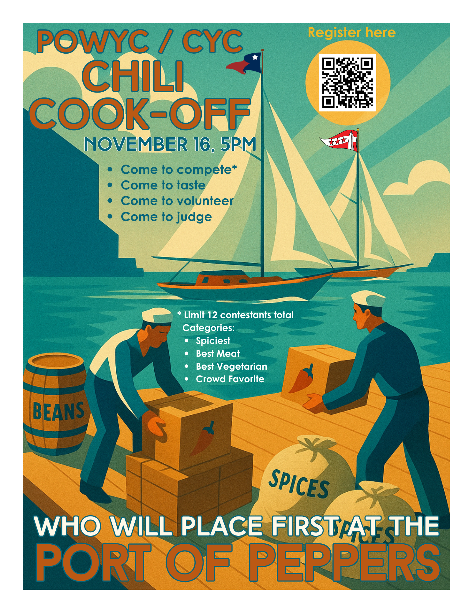 POWYC and CYC members will gather at the CYC Clubhouse to sample chilis and help declare a crowd-favorite. Official judges will also help us determine the main 3 categories (best vegetarian, best meat, and spiciest) in a blind-tasting competition. You can choose to compete (make sure to register), or you can just come to taste!